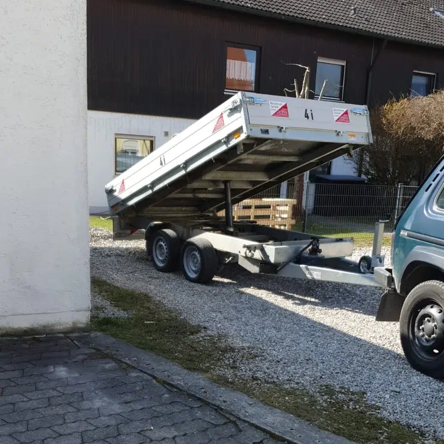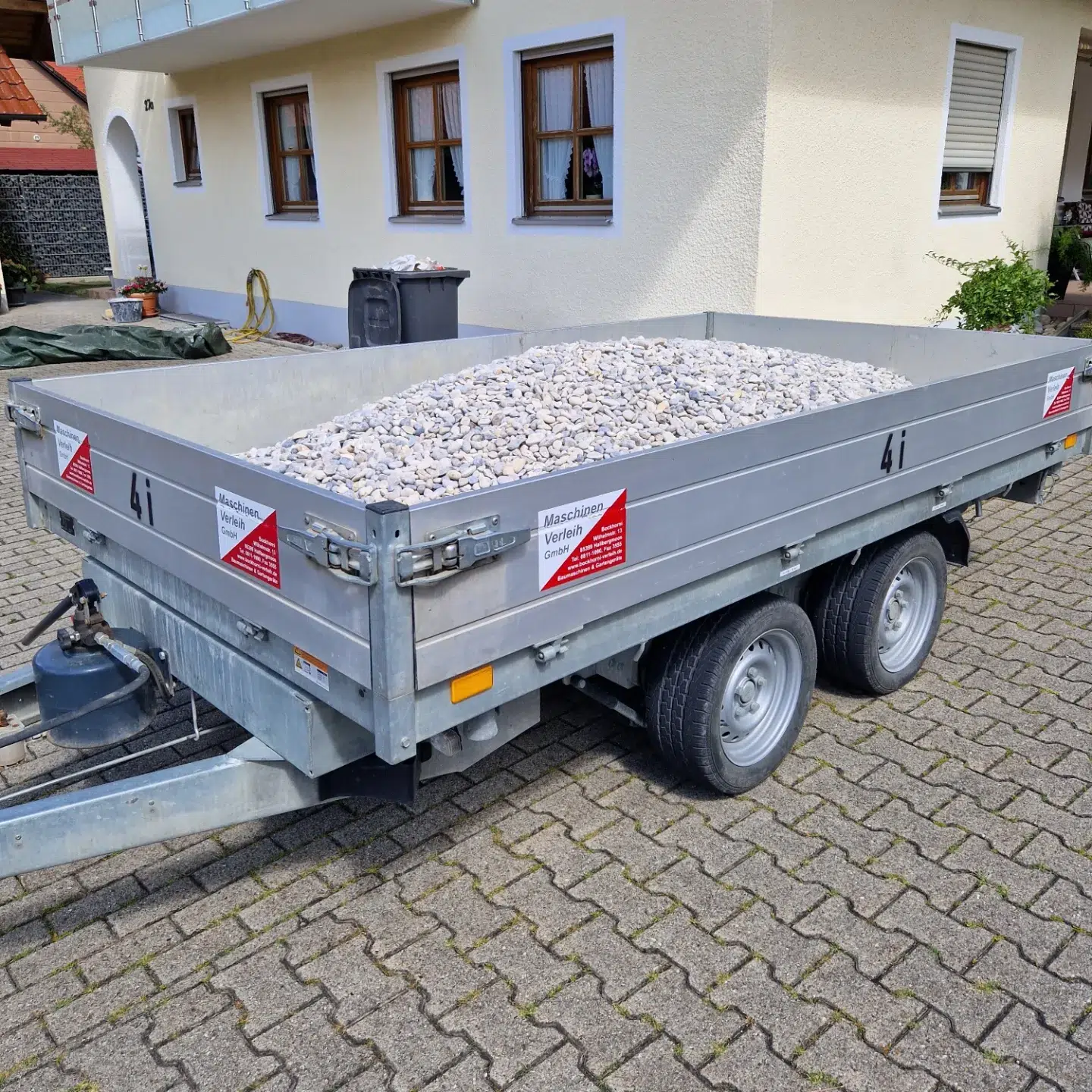 Unser Kipperanhänger transportiert Schüttgut wie Kies oder Erde. Der Kippanhänger kann je nach Anordnung der Splinte nach hinten abkippen oder über die linke oder rechte Seite abkippen. Der Kippvorgang des Kippanhängers kann entweder mechanisch über eine 2-Wege-Handpumpe oder automatisch mit einem Akkuschrauber durchgeführt werden. Bei unserem Kipperanhänger können alle vier Bordwände aufgeklappt werden, um von jeder Seite an das Schüttgut zu kommen. Der Kippanhänger verfügt ebenso über Zurrösen. Somit kann ein kleiner Bagger, Lader oder Dumper zusätzlich transportiert werden. Hierfür können unsere Auffahrrampen zu dem Kipperanhänger mitgemietet werden.