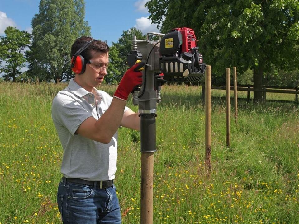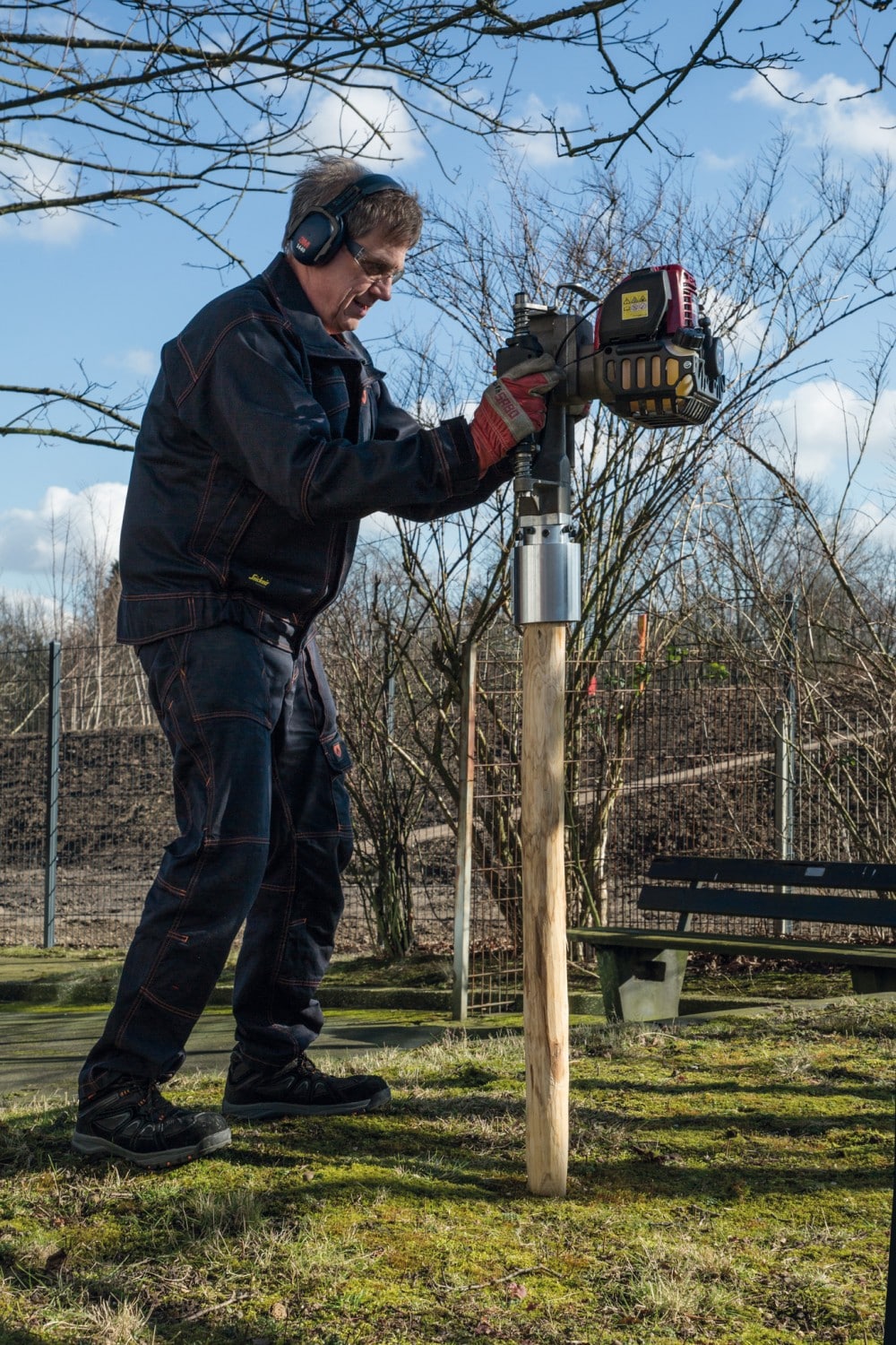 Unsere leistungsstarke Pfahlramme ist stromunabhängig aufgrund seines Honda-Benzin-Motors. Die Schlagglocke eignet sich für Pfosten aus Holz, Metall oder recyceltem Material. Das Pfahlschlaggerät schlägt Pfosten wie Pfähle, Pflanzstangen, Bodenanker, Winzerstäbe oder Brunnenrohre bis maximal 120 mm Durchmesser ins Erdreich. Die Pfähle können rund, eckig, T-förmig oder Z-förmig sein. Die Pfahlramme kommt zum Einsatz beim Zaunbau, Gartenbau, Forstbetrieb oder Baumschule. Je nach Bodenbeschaffenheit und Pfahldicke wird empfohlen, mit einem Erdbohrgerät vorzubohren.