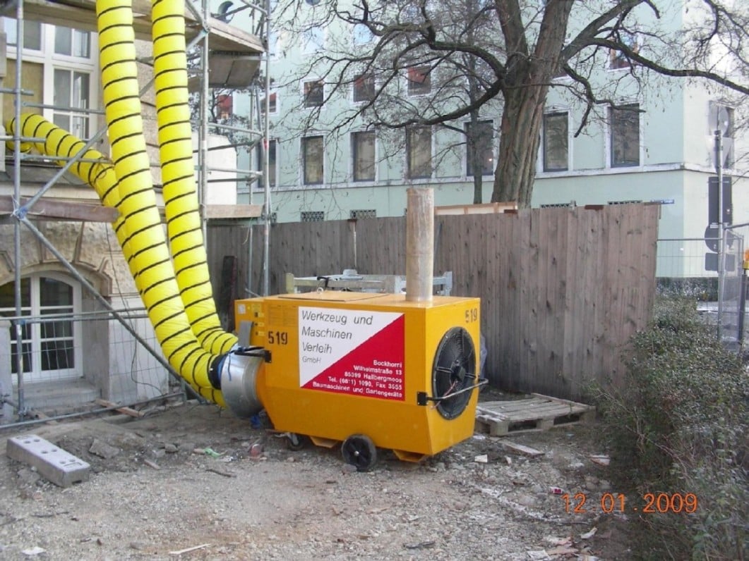 Der Lufterhitzer verfügt über eine integrierte Abgasführung und bläst die Warmluft über Warmluftschläuche in das Gebäude. Das Ölheizgerät ist zum Heizen von großen Räumlichkeiten geeignet. Der Ölheizer ist für geschlossene Räume geeignet, und kommt überwiegend bei Festzelten und Hallen zum Einsatz. Die Ölheizgeräte mit 150 KW Heizleistung sind sehr gefragt auf Baustellen, um Rohbauten über die komplette Winterzeit zu heizen, damit die einzelnen Gewerke im Warmen weiterarbeiten können.