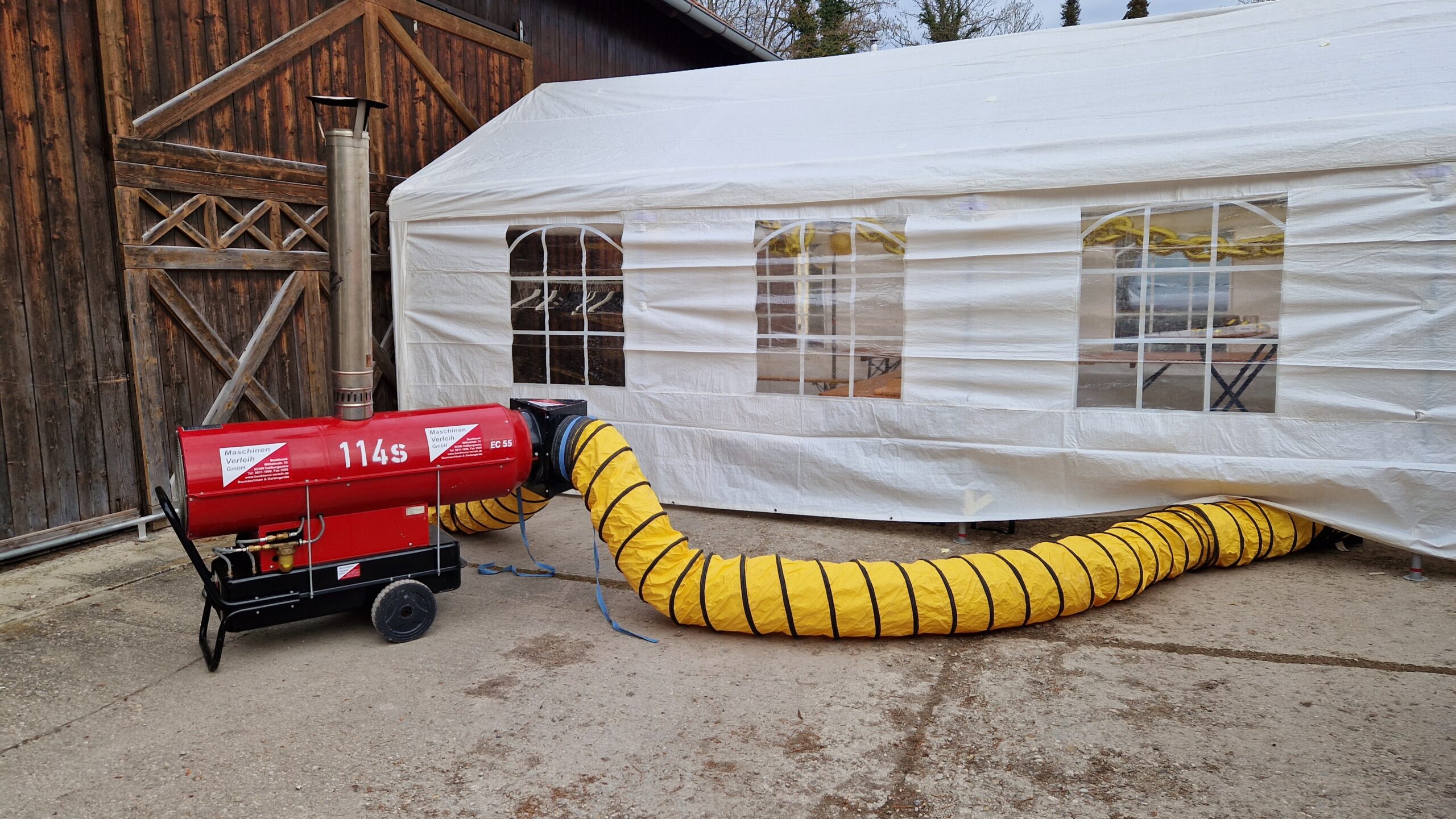Das Ölheizgerät EC55 hat eine integrierte Abgasführung und ist für geschlossene Räume geeignet. Der Ölheizer wird außen aufgestellt und die warme Luft mittels zwei parallellaufenden Warmluftschläuchen in das Gebäude eingeblasen. Ebenso verfügt der Heizer über ein Externthermostat. Das Heizgerät hat einen integrierten Kraftstofftank, welcher wahlweise mit Heizöl oder Diesel betankt werden kann. Dieser Heizer ist ideal für Partys in geschlossenen Zelten, Hütten und Räumen von mittlerer Größe.