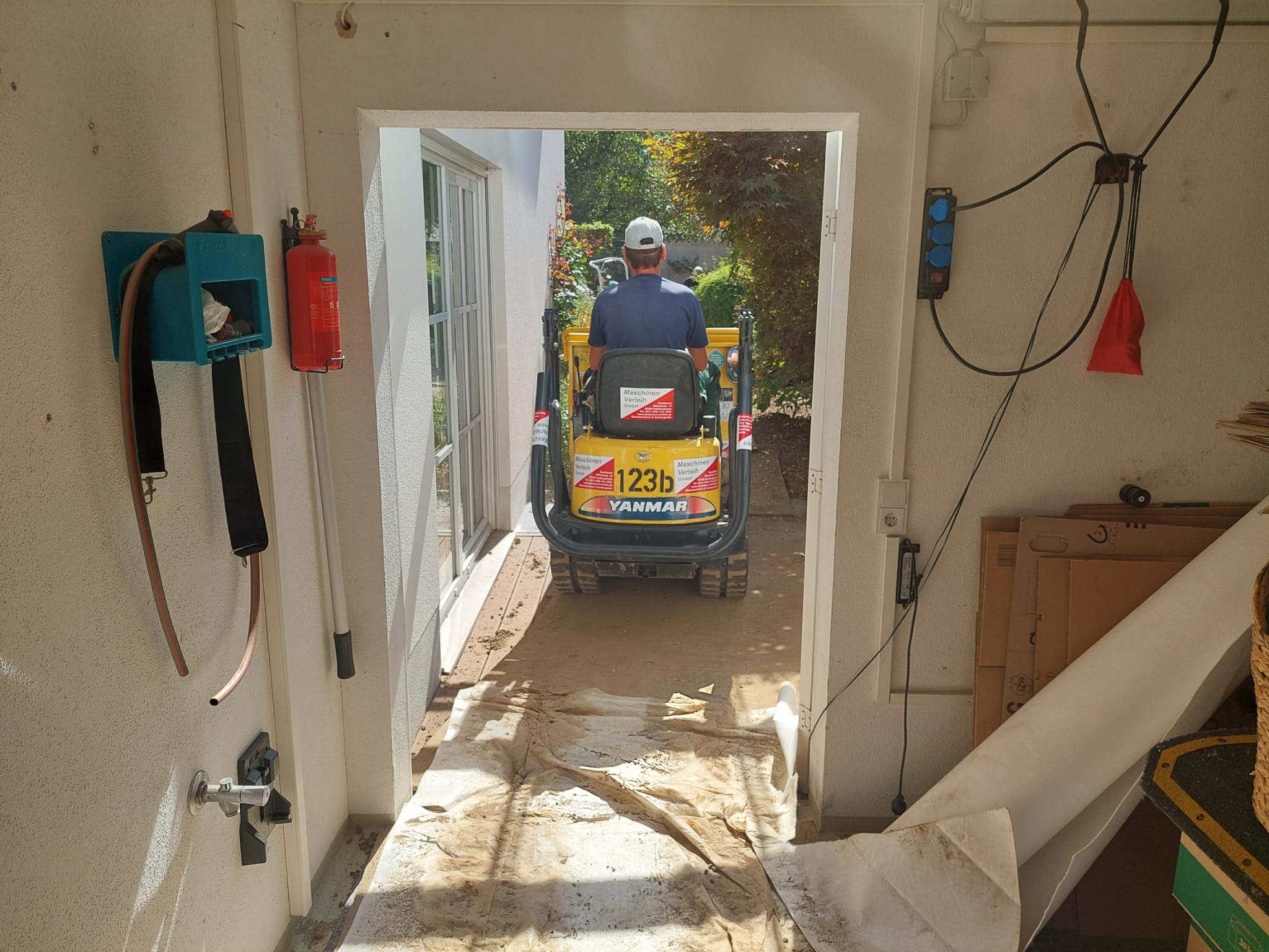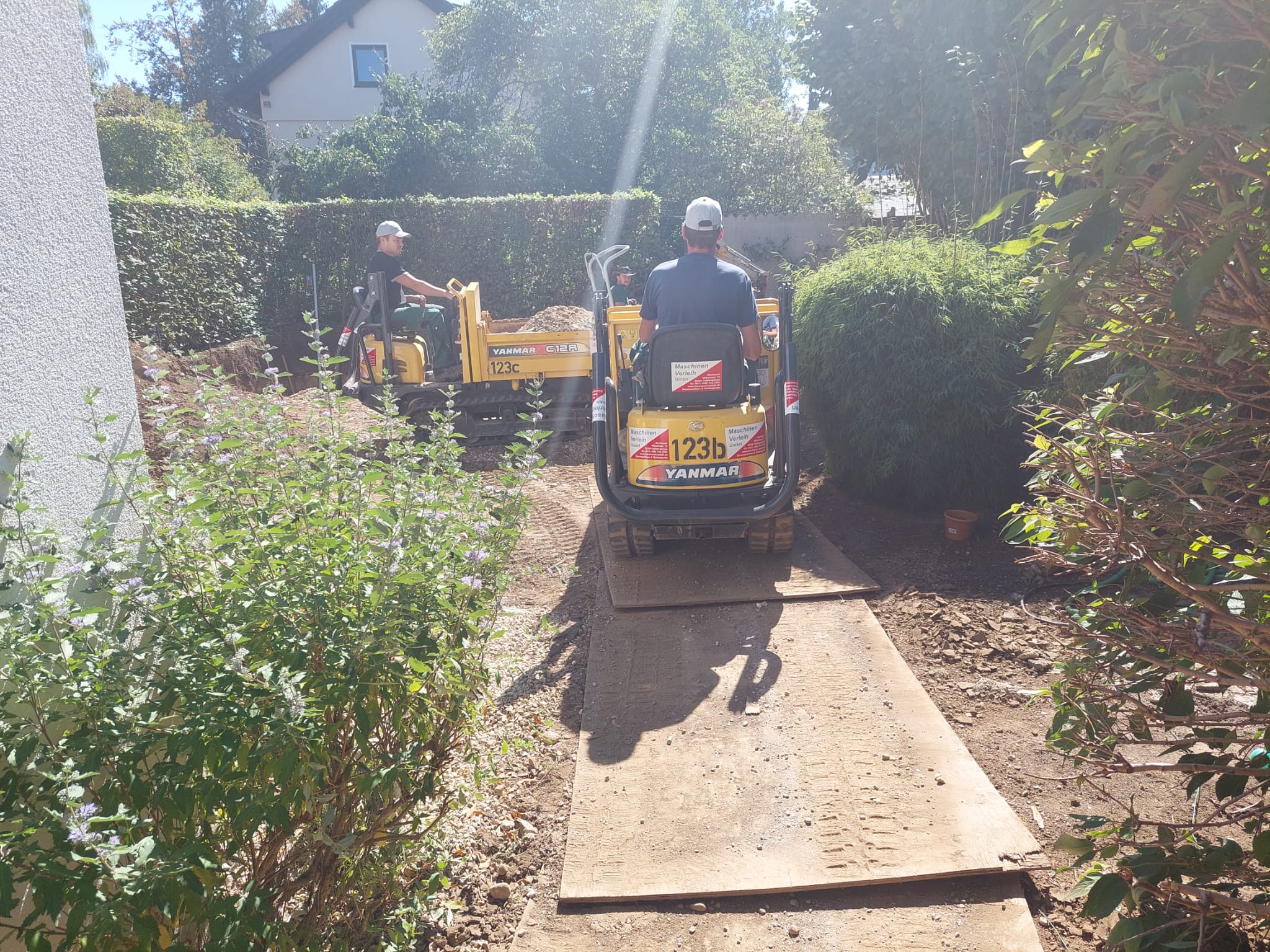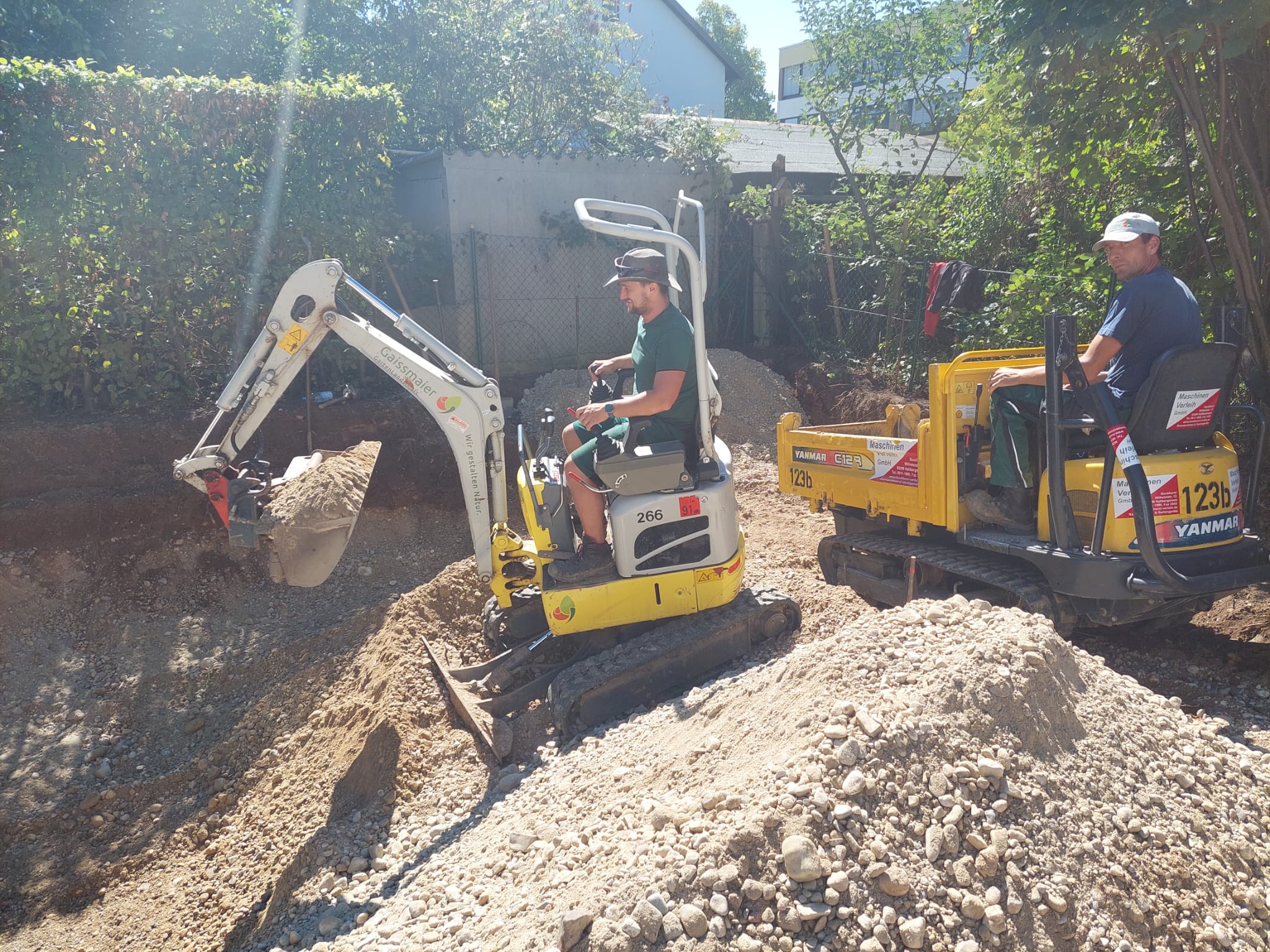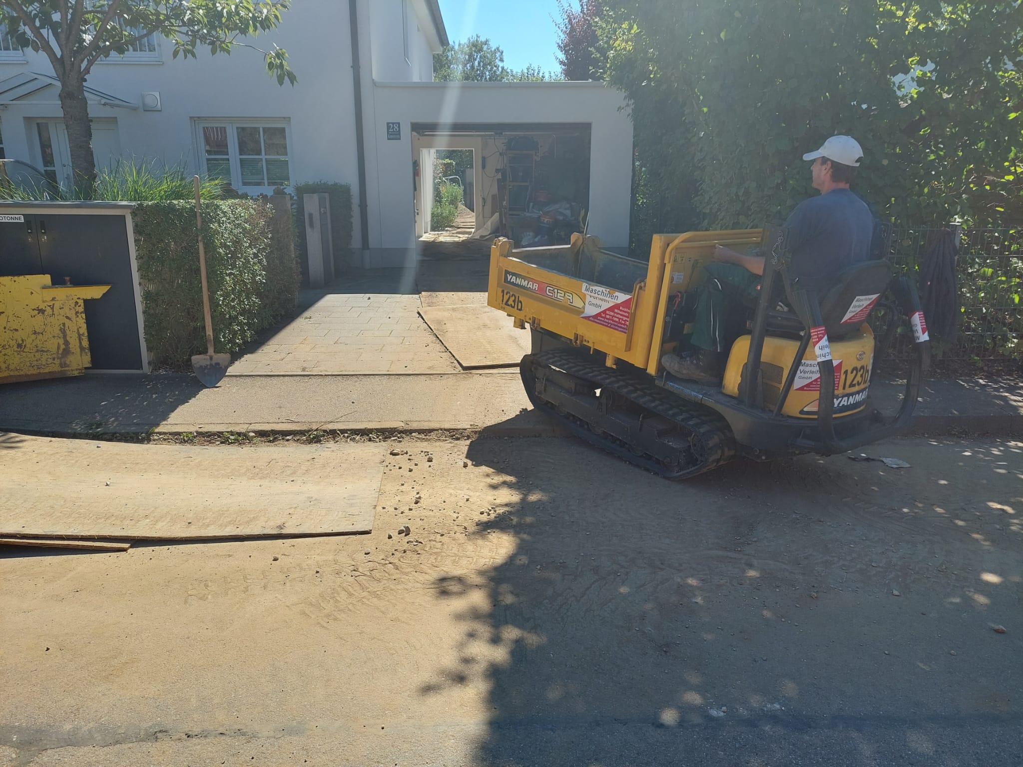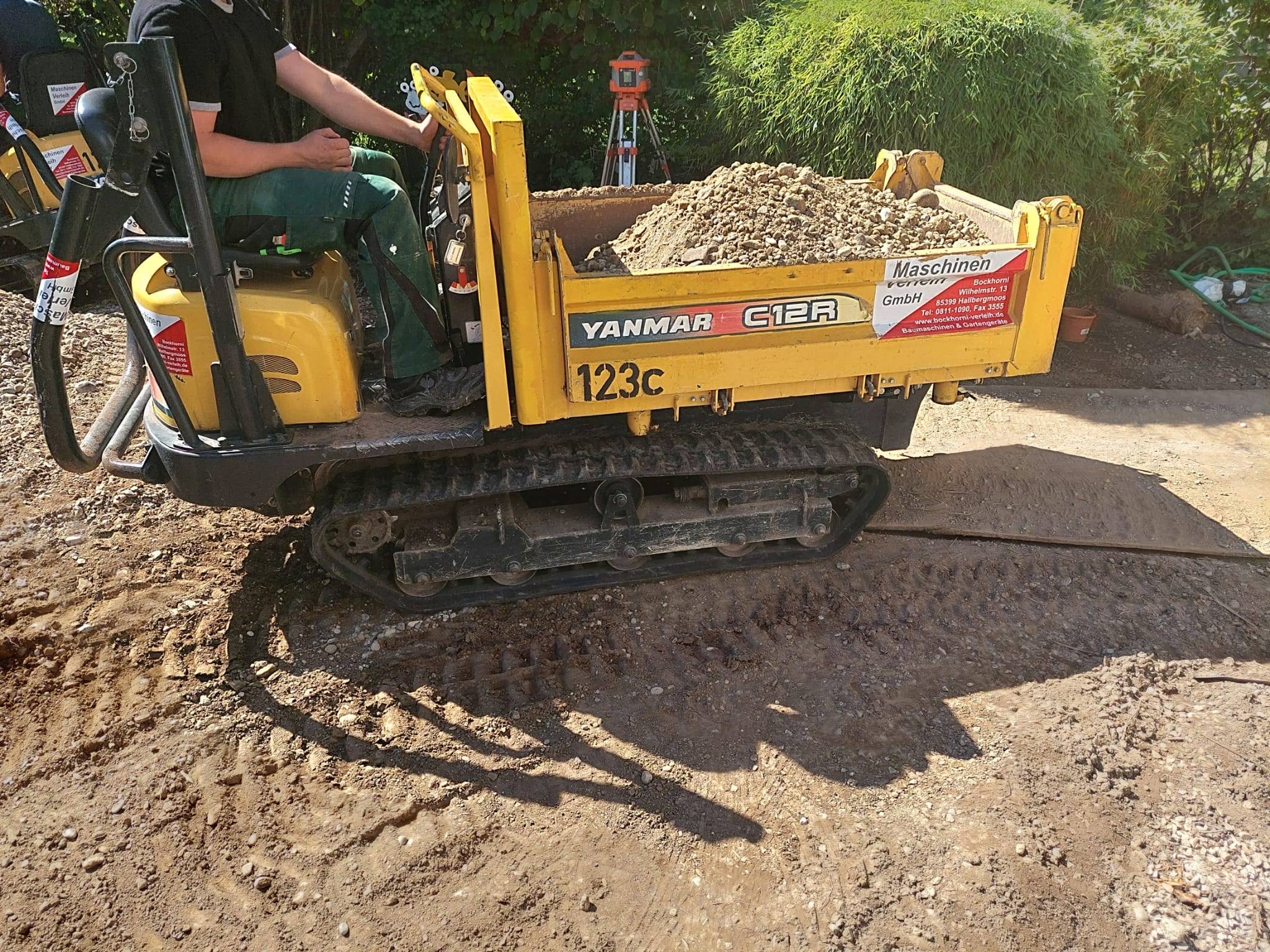 Unser Kettendumper Yanmar C12R ist für alle größeren Transporte von Erde und Kies gedacht. Im Vergleich zu Radladern verfügt der Raupendumper über einen größeren Muldeninhalt von ca. 1 cbm pro Fahrt. Zugleich ist der Dumper mit seinen 96 cm sehr schmal und man kann den Bügel für geringe Durchfahrtshöhen herunterklappen. Zusätzlich verfügt der Kettendumper über eine Dreiseitenkippfunktion, was ihn bei engen Platzverhältnissen umso wertvoller macht.