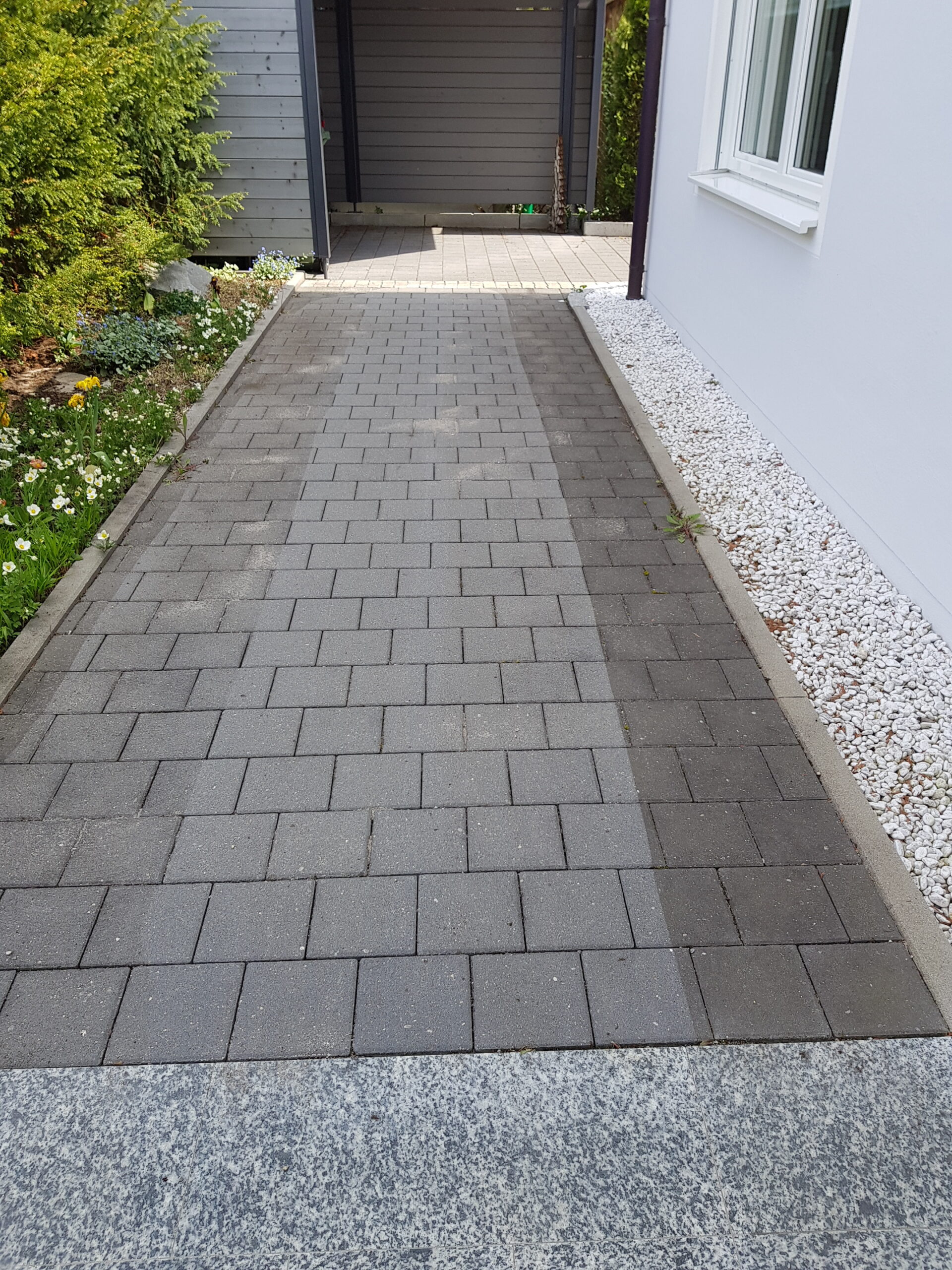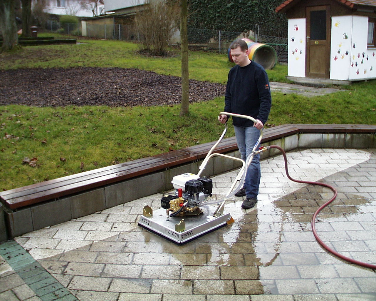 Unser Flächenreiniger ist zur Reinigung von allen Pflasterflächen wie Hofeinfahrten, Parkplätzen oder Gartenwege geeignet. Der leistungsstarke Benzinmotor spritzt bis zu 150 bar Kaltwasser auf das Pflaster. Durch die spezielle Anordnung der Düsen des Pflasterreinigungsgerätes erhält man ein streifenfreies Ergebnis. Der Flächenreiniger arbeitet nur mit Kaltwasser und braucht keine Chemie. Durch die bauartbedingte Haube bespritzt das Pflasterreinigungsgerät keine Fassaden. Der Flächenreiniger ist zusammenklappbar und passt in den meisten Kofferräume von PKW-Autos.
