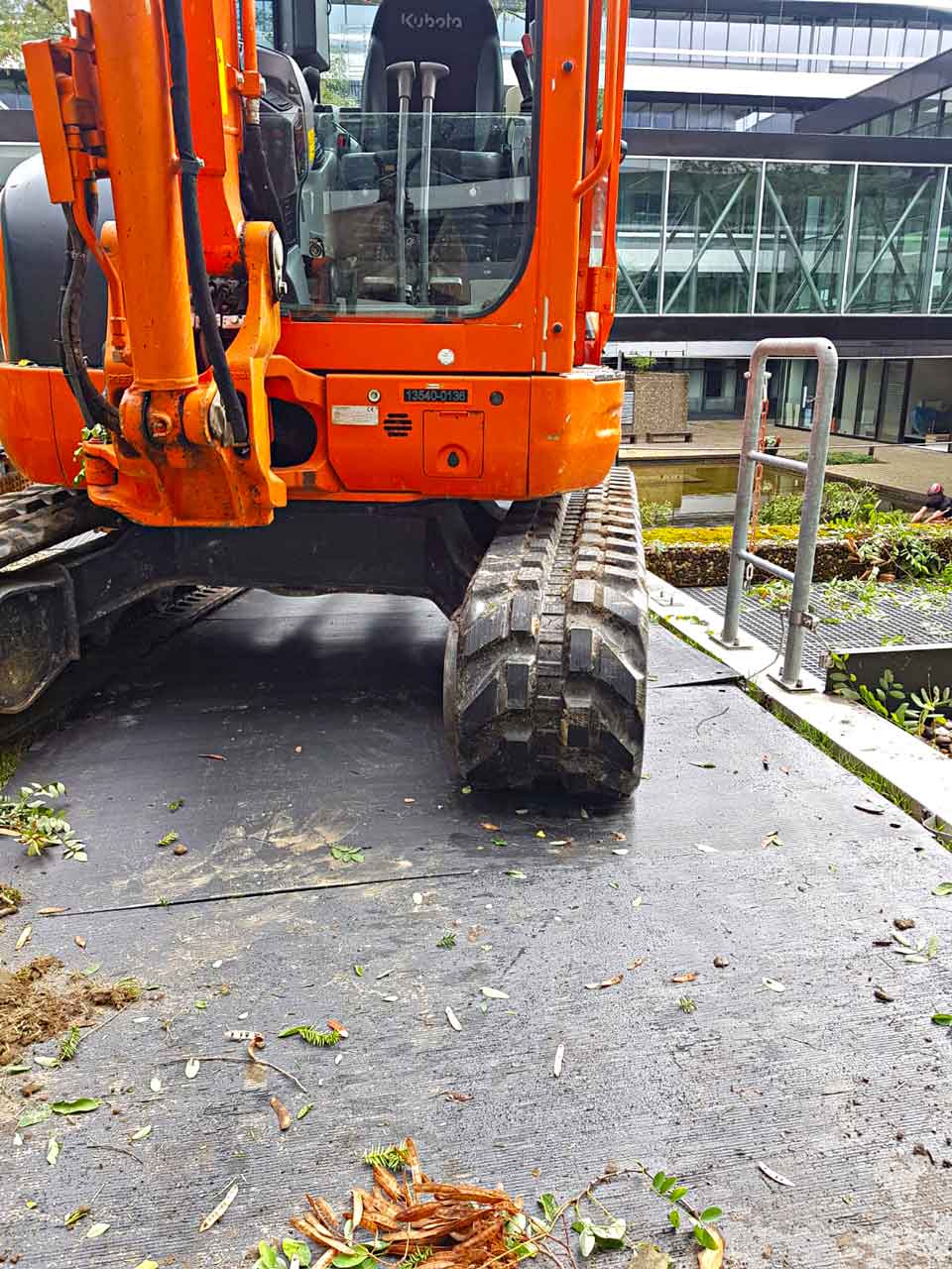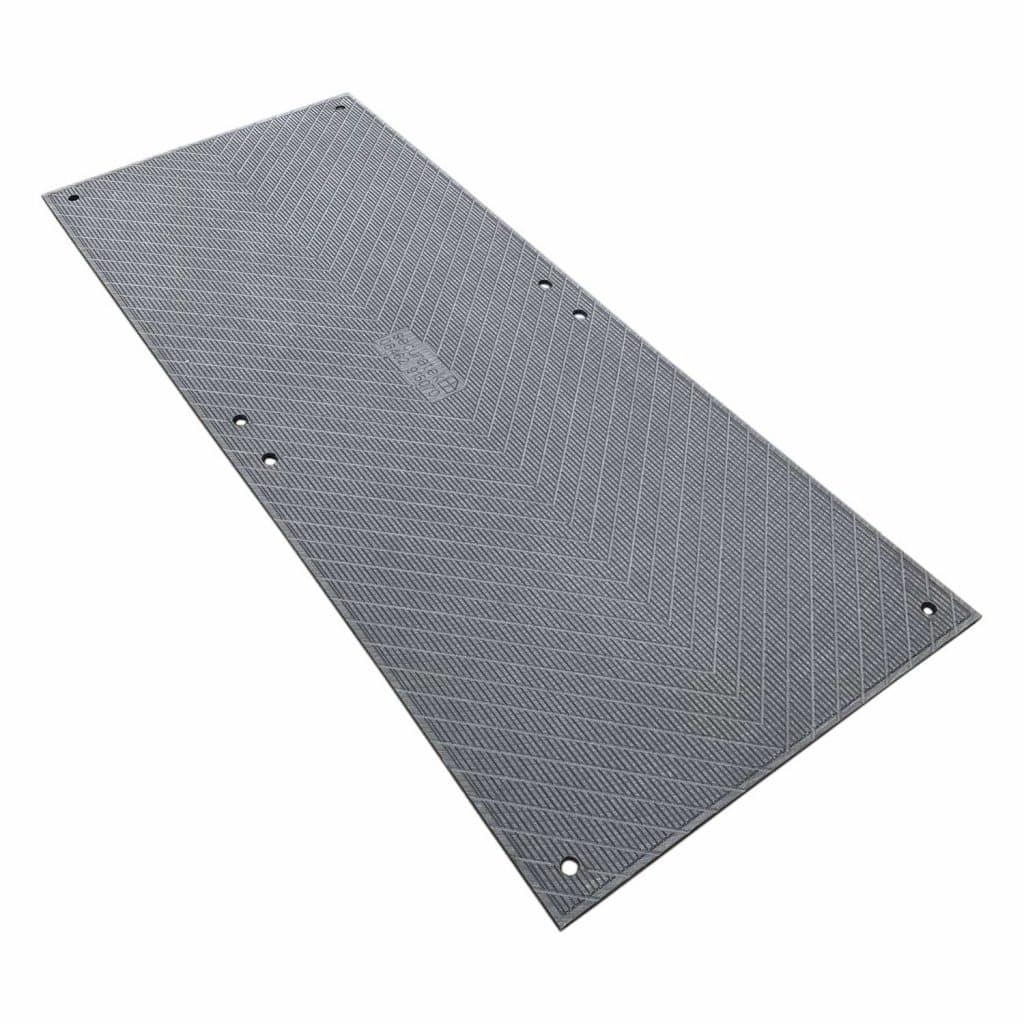 Die Bodenschutzplatte kommt zum Einsatz, wenn Baumaschinen oder Fahrzeuge über einem Boden fahren, der geschützt werden soll. Die Fahrmatten können in Gärten oder Wiesen untergelegt werden, damit der Untergrund von Flurschäden des darauf fahrenden Baggers oder Laders geschont wird. Jede Bodenschutzmatte ist mit 18 kg Eigengewicht leicht und handlich. Die mobile Baustraße kommt auch zum Einsatz bei Veranstaltungen, wo die Veranstaltungsfläche meist auf einem weichen Boden wie Rasenfläche, Wiese oder landwirtschaftlicher Boden stattfindet. Ebenso schützen unsere Fahrplatten die darauf fahrende Baumaschine oder Fahrzeug vor dem Einsinken oder Festfahren in unbefestigtem Boden. Die Belastbarkeit der Fahrbahnplatte ist je nach Bodenart unterschiedlich. 40 Tonnen bei festem Untergrund wie Kies oder Pflaster. 20 Tonnen Belastbarkeit bei weichem Untergrund wie Rasen oder Wiese. 8 Tonnen hält die Bodenschutzplatte bei sehr weichem Untergrund wie Sumpf oder Lehm aus.